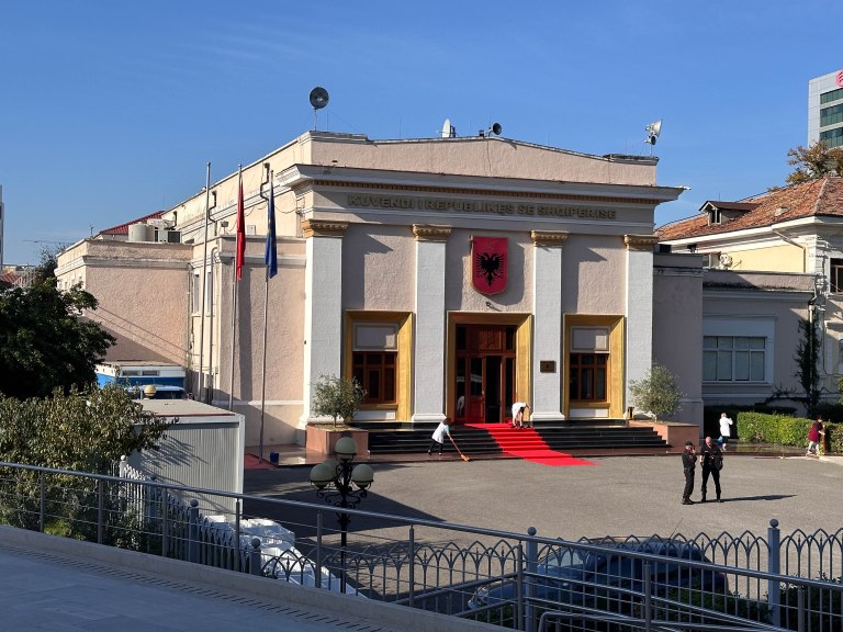 Fast wie die bescheidene Hütte des Gärtners der Moschee steht unmittelbar daneben das Parlamentsgebäude von Albanien.