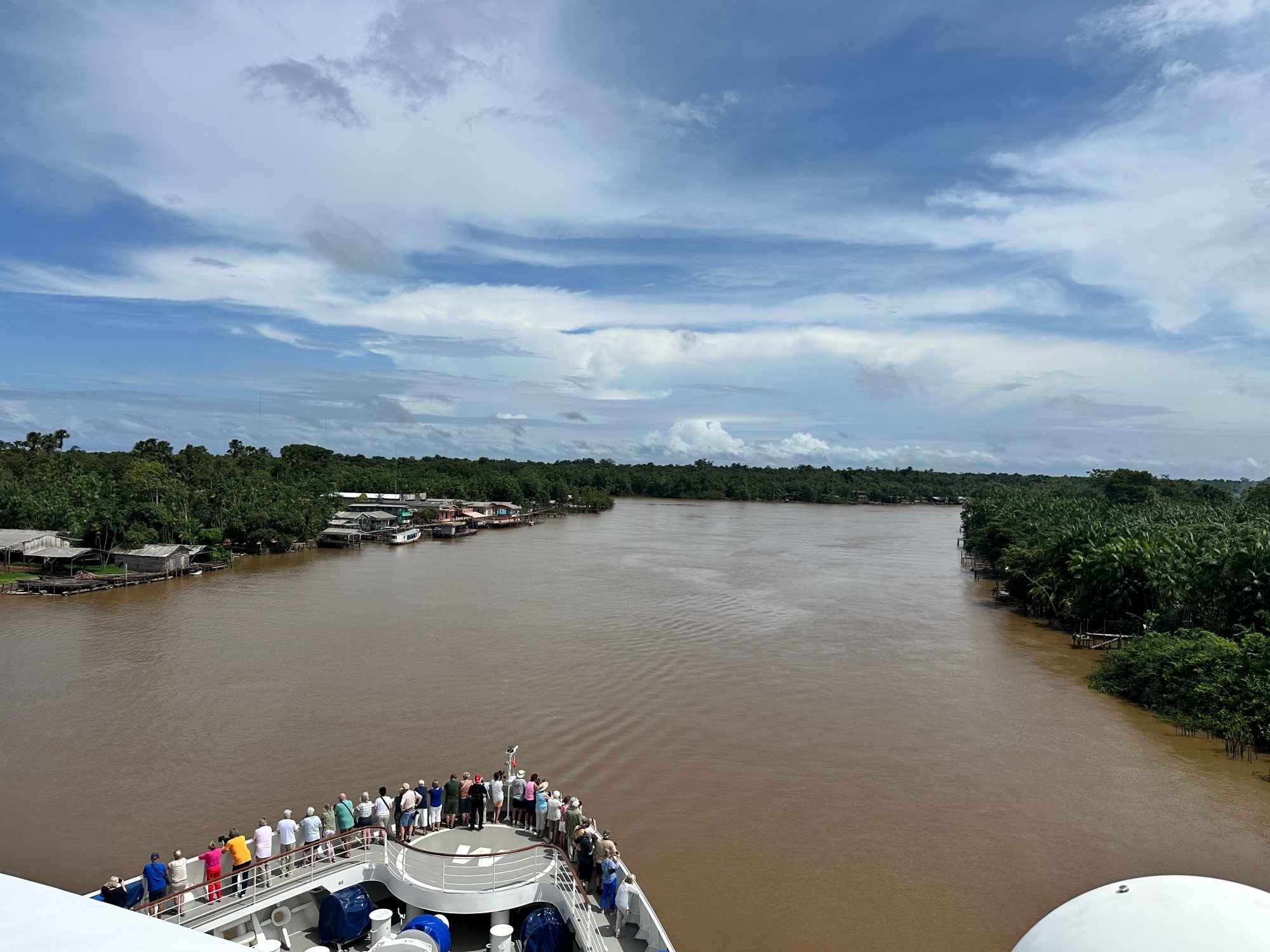 Dieser trennt die weltweit grösste Flussinsel ab, die Fläche aufweist, die jener der Schweiz nahe kommt. Diese Insel ist durch keine Brücke mit Nachbarinseln oder dem Festland verbunden, alles muss mit dem Boot herbeigebracht werden. Da gibt es auch wieder ein kleines Strassennetz, aber das Hauptverkehrsmittel der Bewohner hier ist das Boot. Es ist zu erkennen, dass Menschen in den Häusern am Fluss nur selten ein so grosses Schiff wie die Hanseatic Spirit sehen, überall strömen sie herbei und bestaunen und fotografieren dieses. Es gibt einige recht enge Bogen zu fahren, die die Mannschaft auf der Brücke fordern.