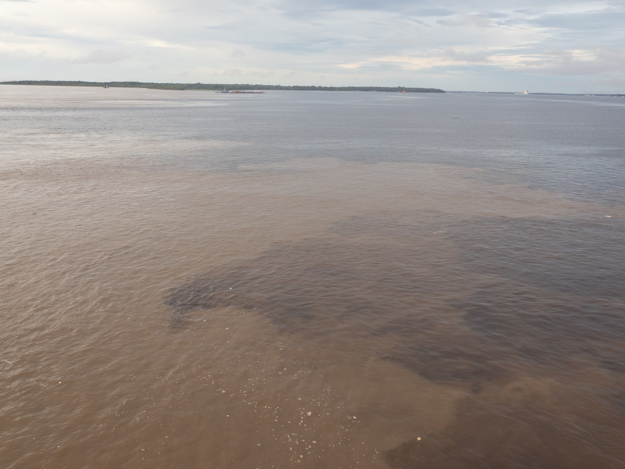 Daneben bringt der Solimões sehr viel Sedimente aus den Anden mit sich. Das Wasser ist neutral (PH 6.5-7) und sieht eher aus wie ein Milchkaffee. Hier bei der Mündung vermischen sich die beiden Gewässer nicht sofort, sie fliessen vielmehr noch einige Kilometer (ca 6-10km) nebeneinander her, wobei der schwarze Streifen immer schmaler wird. Grosse Wirbel zeigen schön auf, wie sich die Vermischung abspielt.
