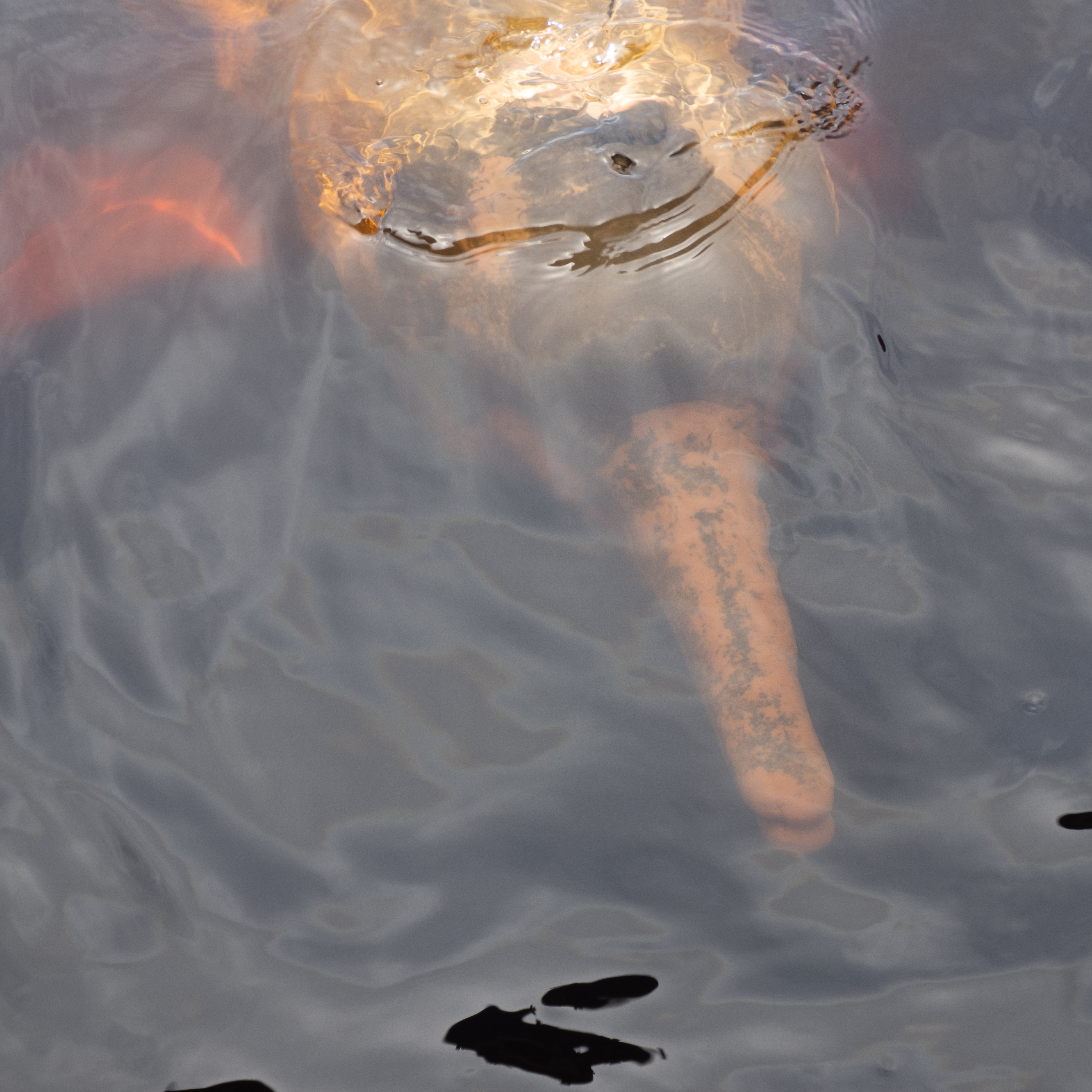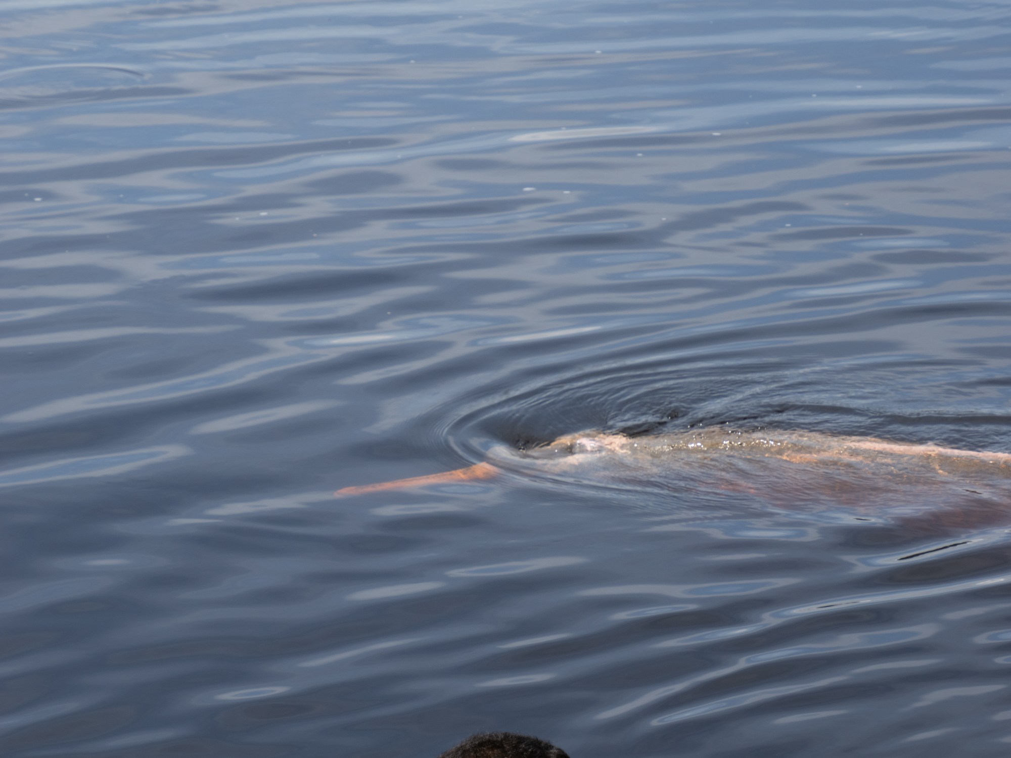 Wir haben diese Tiere bis dahin gelegentlich kurz auftauchen sehen. Im trüben Wasser des Amazonas sind sie kaum zu sehen und sie tauchen jeweils nur kurz auf, um zu atmen. Im Gegensatz zu den Flussdelfinen in Asien (im Ganges) seien sie hier nicht stark gefährdet. Es gibt hier 2 Arten, einen grauen Flussdelfin, der aus dem Meer eingewandert ist und den Meeresbewohnern noch stärker ähnelt. Hier geht es vor allem um den Boto, wie er hier genannt wird, den rosa Flussdelfin. Von den Verwandten im Meer unterscheiden sie sich deutlich; sie haben eine sehr ausgeprägt Schnauze, fast ein Schnabel und eine deutliche Melone (wie der Beluga), ein Organ, das bei der Echolokation dient. Die Rückenfinne ist nur eine leichte Erhebung, kaum als solche wahrnehmbar. Sie sind extrem an das Leben im trüben Fluss und den Überschwemmungsgebieten angepasst; sie können den Kopf wesentlich mehr drehen als andere Zahnwale und die anderen Delfine, so können sie Beute eben auch in den überschwemmten Wäldern jagen.