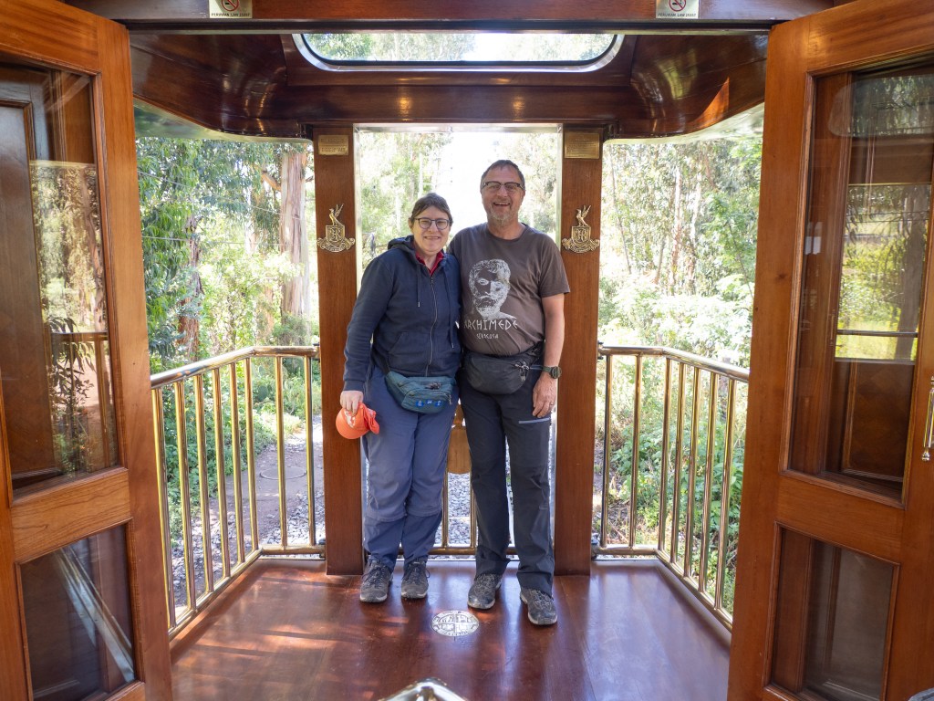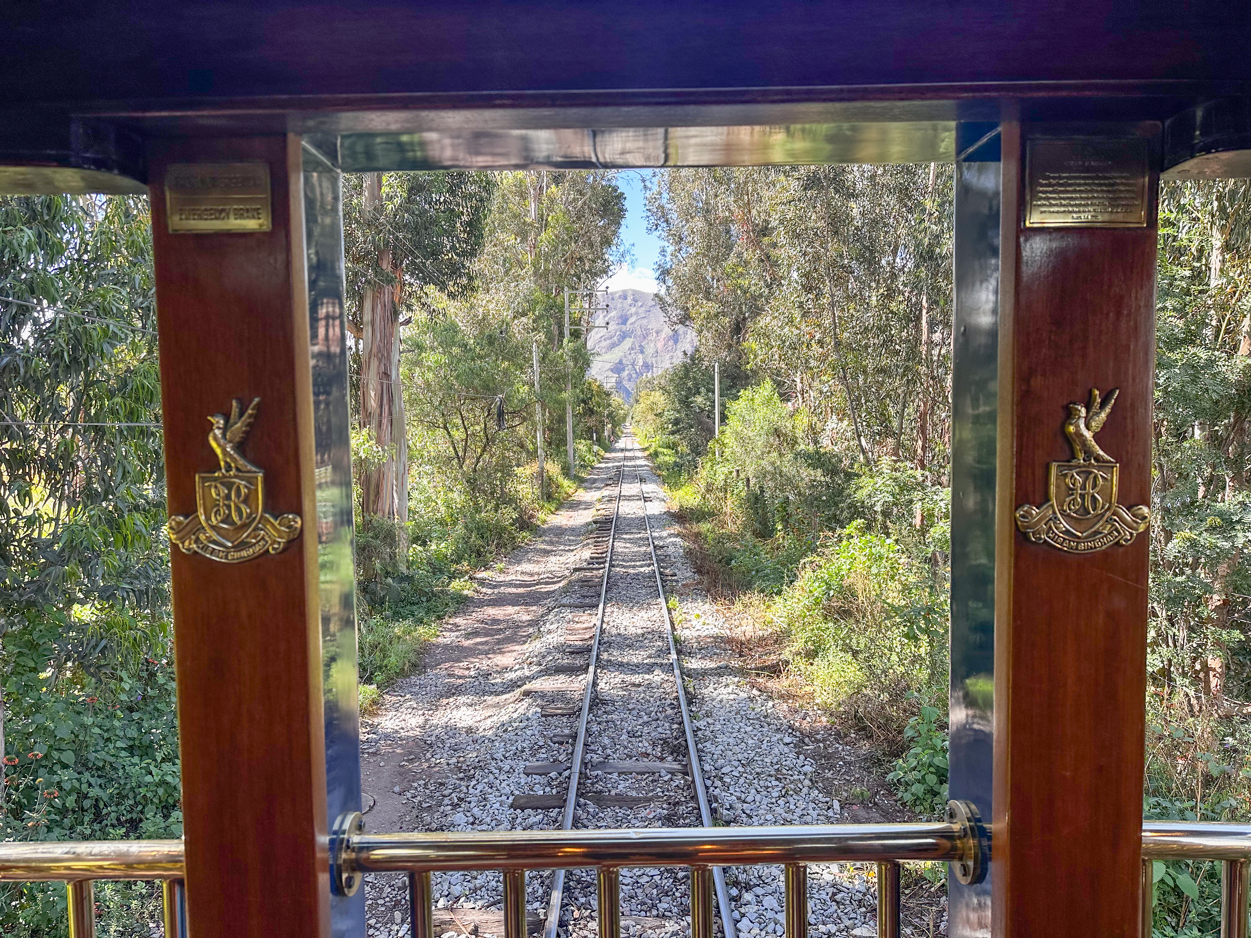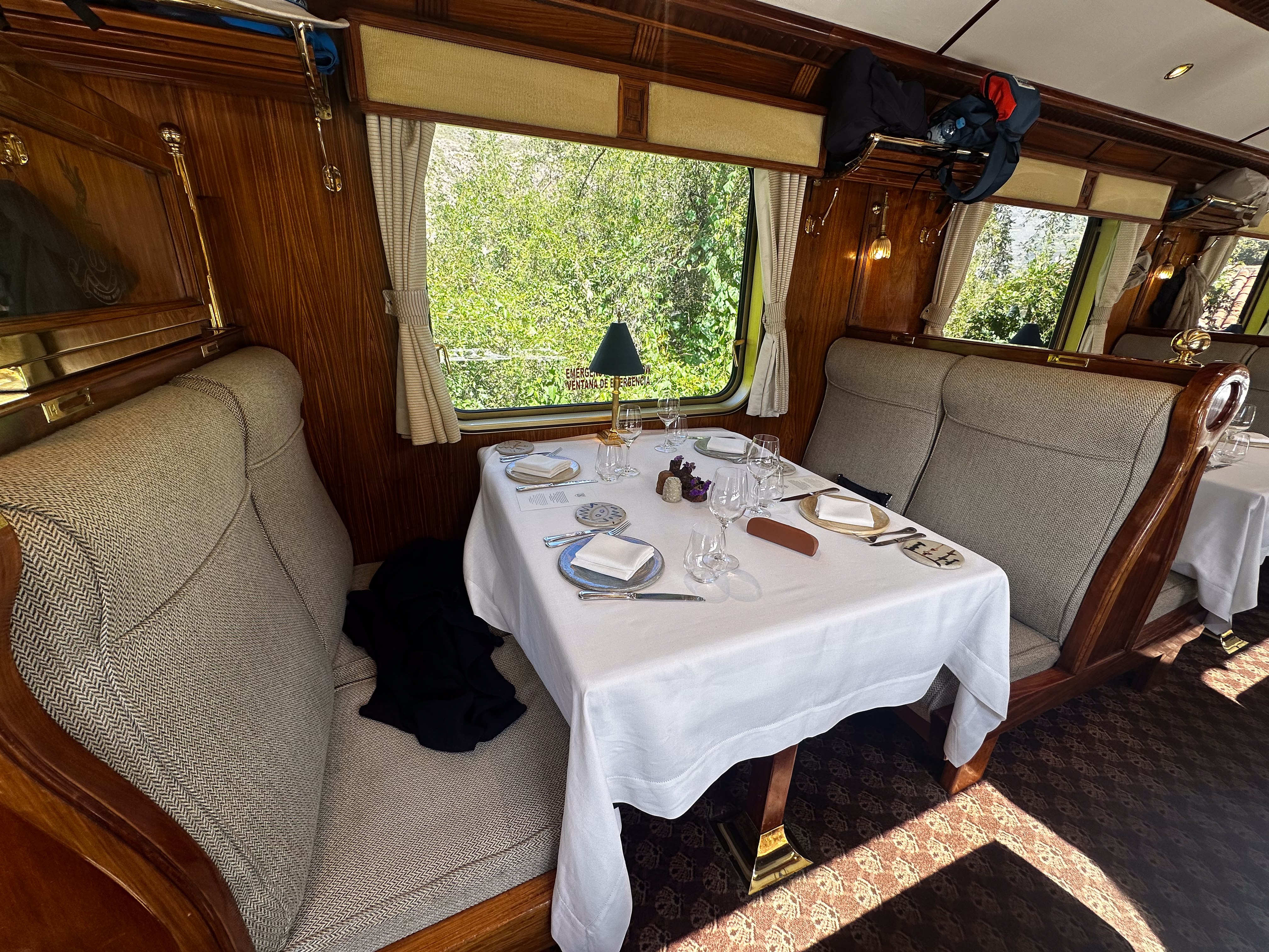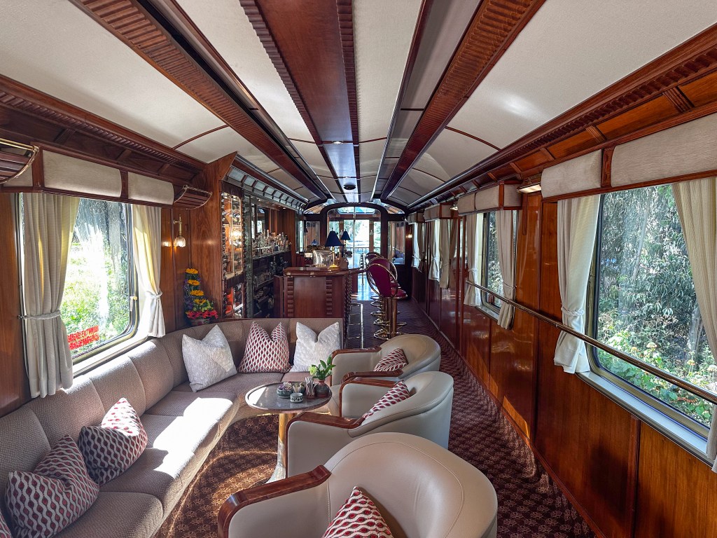 Der Zug ist luxuriös ausgestattet und führt am Ende einen Bar-Waggon mit offenem Balkon am Ende. Hier spielt eine Musikgruppe auf und es werden Drinks ausgeschenkt. Während der Fahrt gibt es ein Mittagessen, eine Kürbiscreme zum Start, Rinderfilet mit verschiedenen Beilagen als Hauptgang und ein schön dekoriertes Schokoladenmousse zum Dessert.