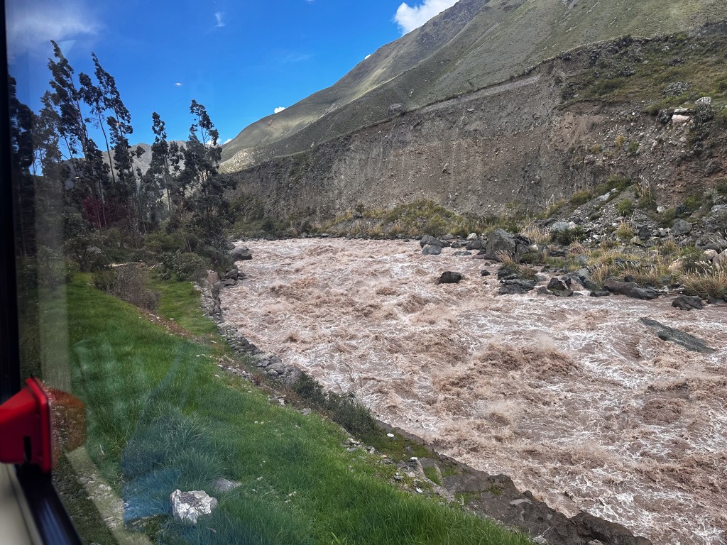 Nach der Wartezeit von gut 2 Stunden werden wir gebeten, den Zug zu verlassen, gehen zu Fuss auf dem Gleisbett zu einem anderen Zug, der nun wesentlich weniger komfortabel ausgestattet ist. Aber er ruckelt genauso und fährt nicht wesentlich schneller. Dieser bringt uns in der Folge nach Aquas Calientes, oder wie die Station heute heisst, Machu Picchu Pueblo. Der Urubamba ist hier ein reissender Fluss und es gibt auf den letzten Kilometern auch keinerlei Strasse mehr. Nicht auszudenken, wen die Entgleisung hier passiert wäre.