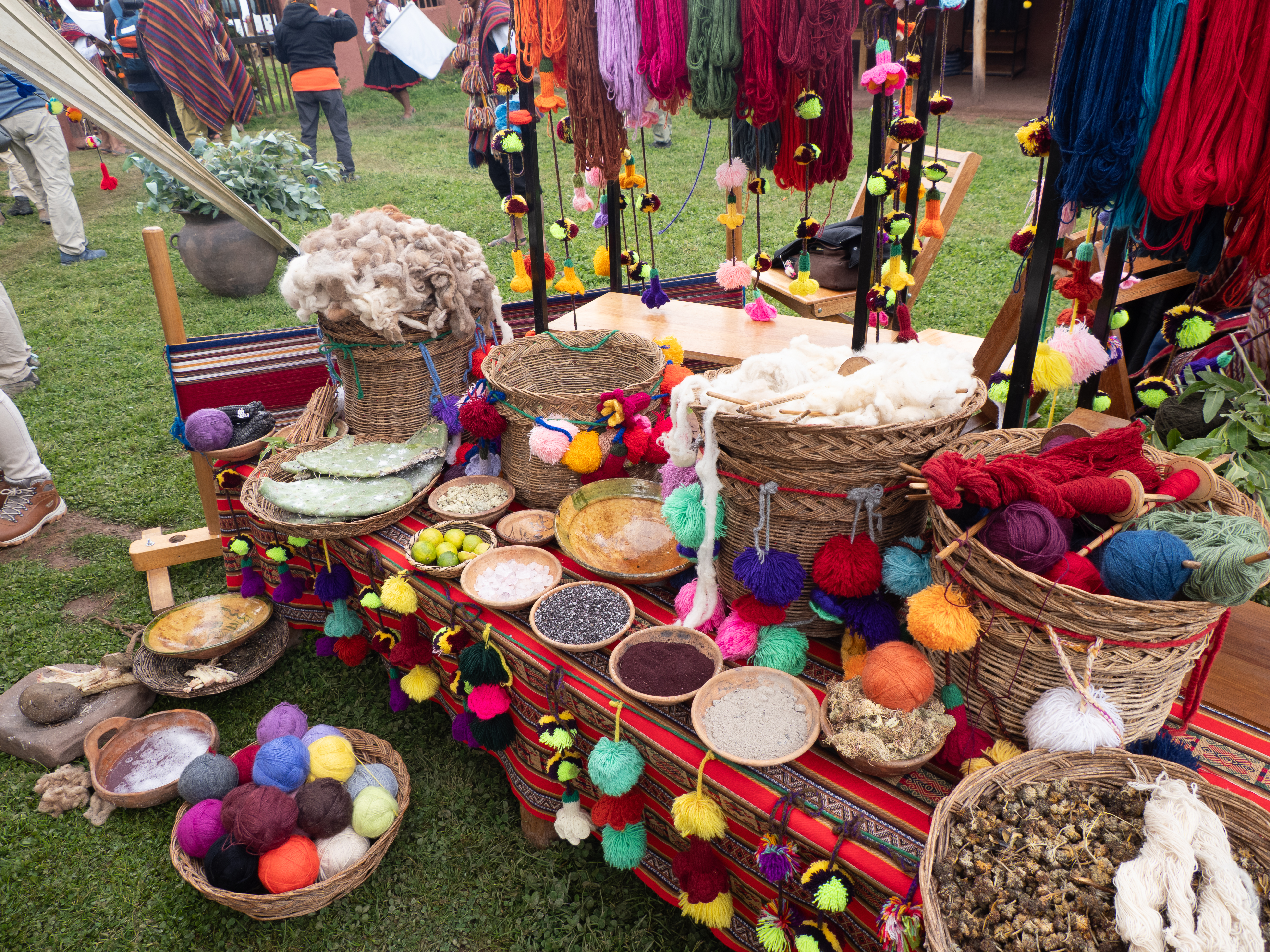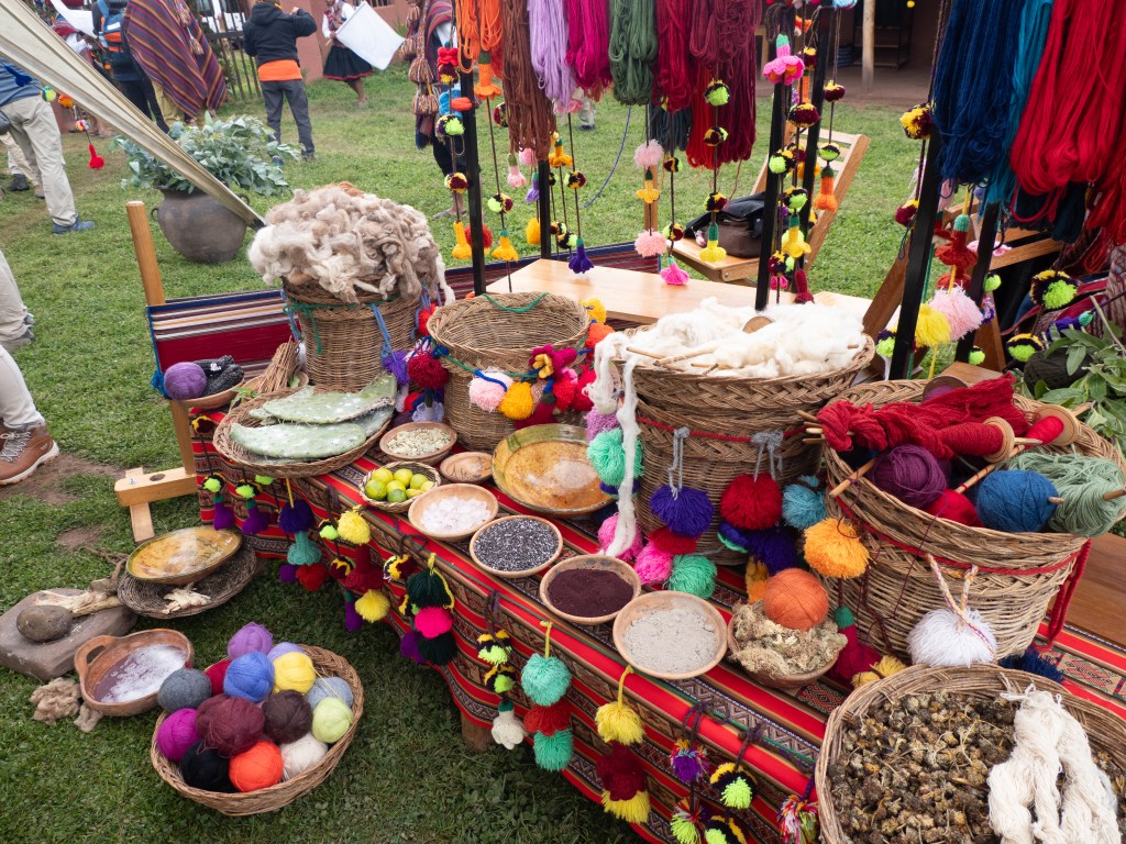 Aus der Wolle ihrer Tiere (nicht der Meerschweinchen) machen sie unterschiedliche Gegenstände. Dabei wird diese von der Schur an selber verarbeitet, gereinigt, gefärbt, gesponnen und verwoben. Auch die Stoffe für Ihre Kleidung machen sie wohl selber und vermutlich auch die Kleider selber. Die Wolle wird mit Naturmitteln gereinigt, mit Pflanzensäften oder zerdrückten Schildläusen (die haben wir früher auch in Getränken zu uns genommen) gefärbt und in Handarbeit gewoben. Die Gewebe sind sehr dicht und ein Poncho daraus schützt auch gut vor Regen. Dass er warm ist, davon konnten wir uns selber überzeugen.