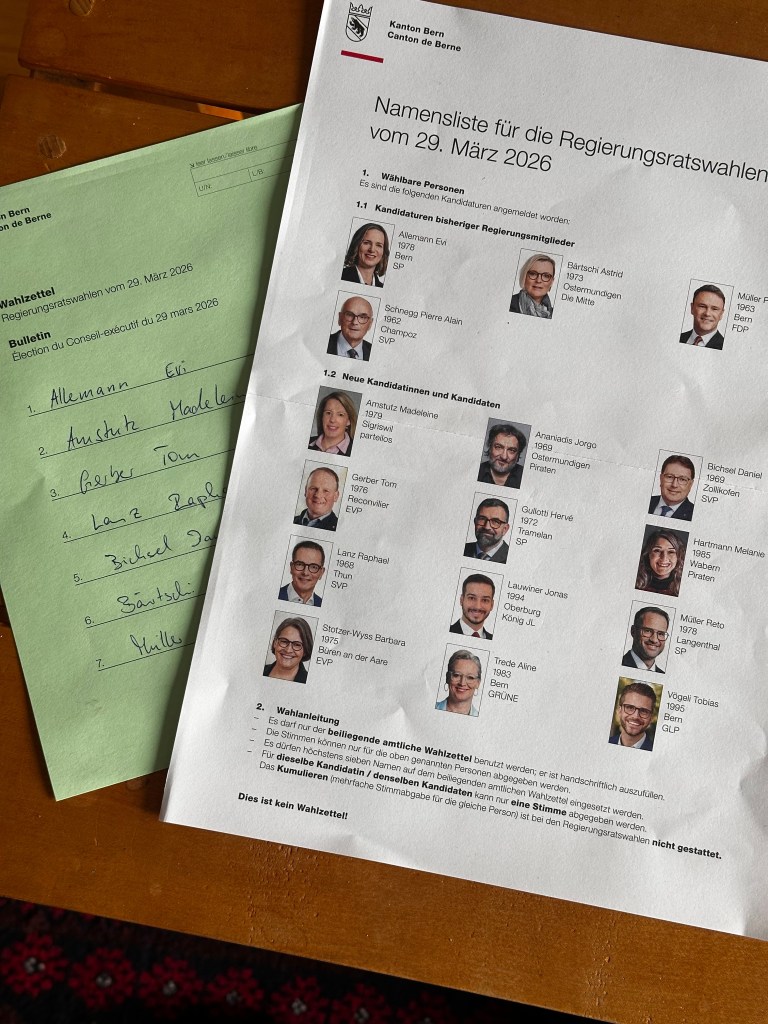 Im März 2026 wurden im Kanton Bern Parlament (Grossrat) und Regierung (Regierungsrat) neu gewählt. Im Grossen Rat sitzen 160 Parlamentarier und im Regierungsrat 7 Mitglieder. Anhand dieses Beispiels zeige ich Euch auf, wie das in der Schweiz so funktioniert.