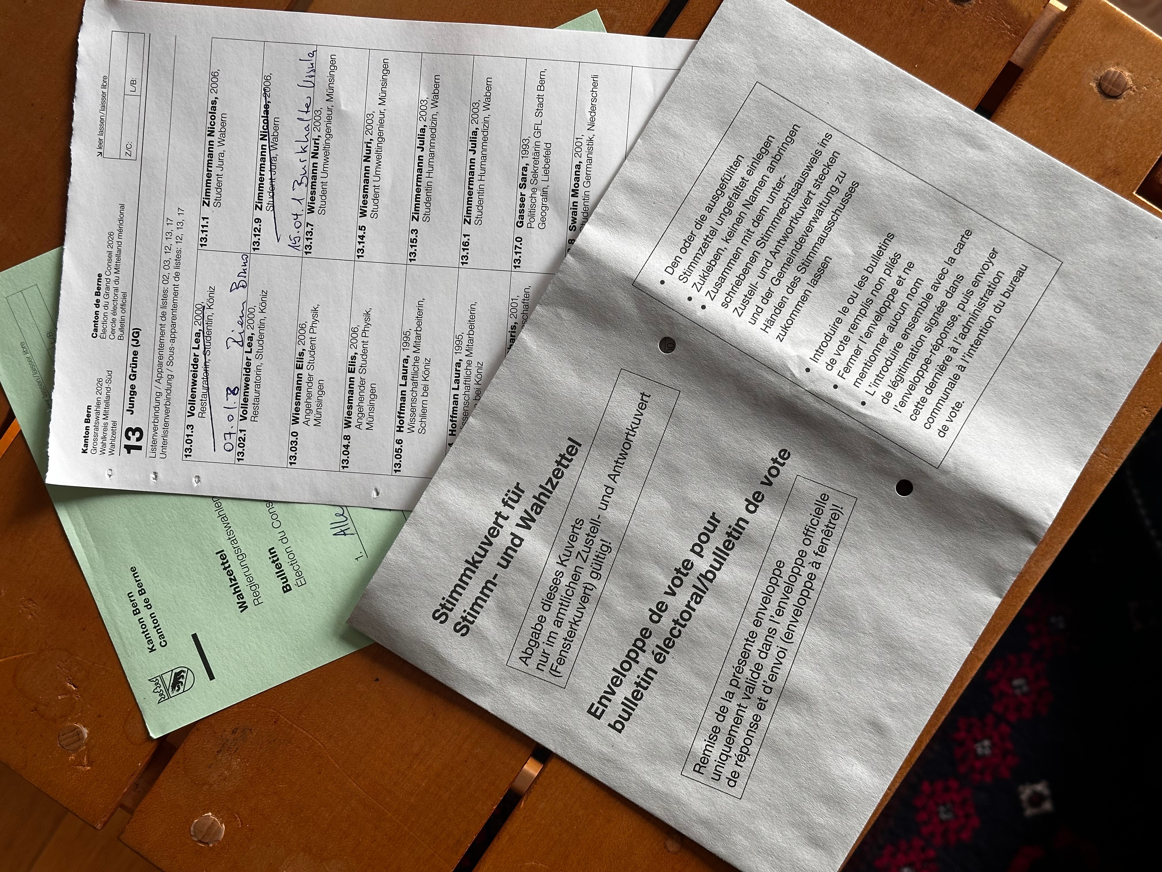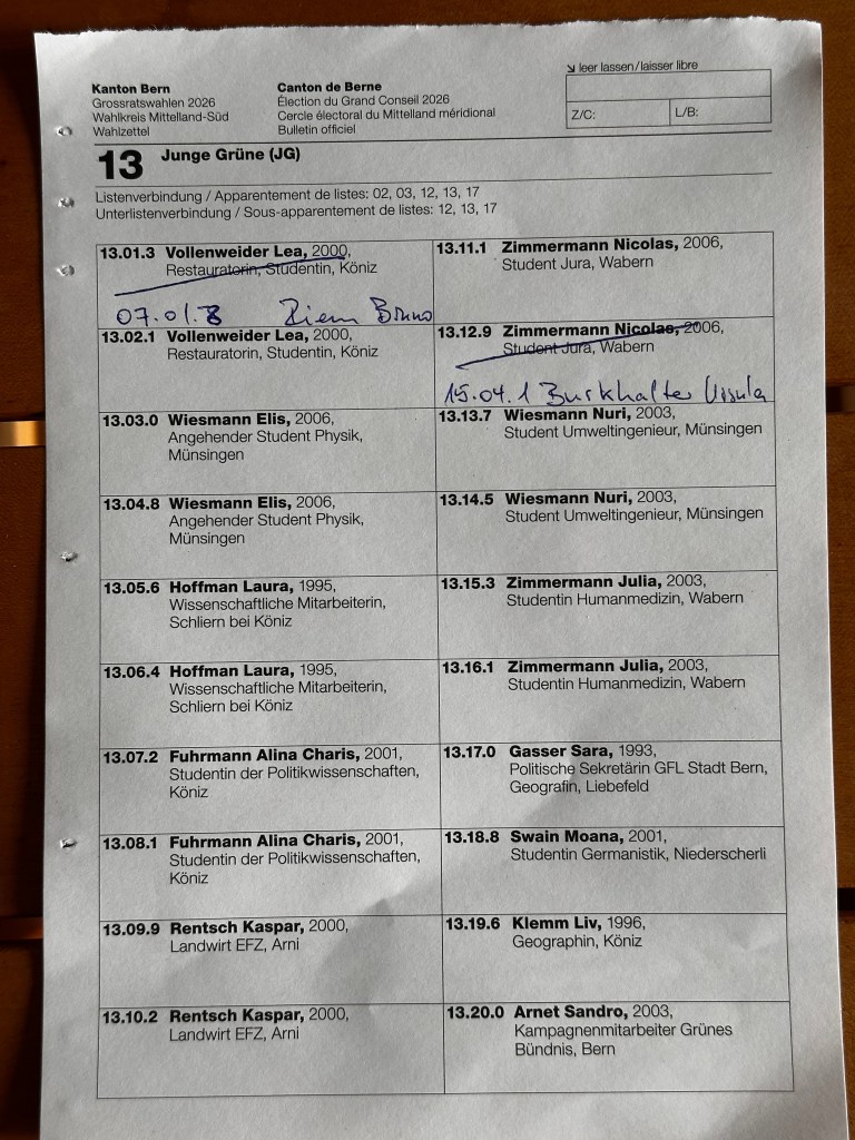 Die Wählenden dürfen 20 Namen aufführen, wobei nur Personen aufgeführt werden dürfen, die auf einer der Listen kandidieren. Wir dürfen Kandidaten unterschiedlicher Listen beliebig mischen und wir dürfen Kandidaten auch 2x auf die Liste setzen. Das bezeichnet man hier als panaschieren (mischen) oder kumulieren (doppelt aufführen).